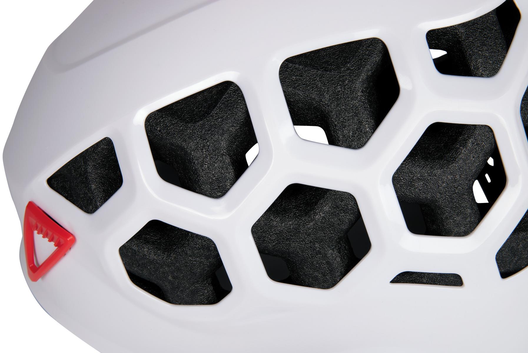 Zewnętrzna skorupa ABS ma dodatkowe formowanie, aby była mocniejsza i bardziej sztywna w miejscu, w którym łączy się z otworami wentylacyjnymi i krawędziami. Miękka wyściółka wewnętrzna łączy się z 18 bocznymi i tylnymi otworami wentylacyjnymi, zapewniając wyjątkowy komfort i oddychalność. Otwory wentylacyjne są specjalnie rozmieszczone i rozmiarowane, aby zapewnić maksymalną oddychalność bez uszczerbku dla ochrony. System regulacji tylnego pokrętła jest łatwy w obsłudze jedną ręką i chowa się w kasku, dzięki czemu jest chroniony wewnątrz plecaka w trakcie transportu. Uchwyt na czołówkę jest zaprojektowany tak, aby można było przymocować czołówkę bez zdejmowania kasku za pomocą dwóch ergonomicznych przednich klipsów i tylnego elastycznego uchwytu.
