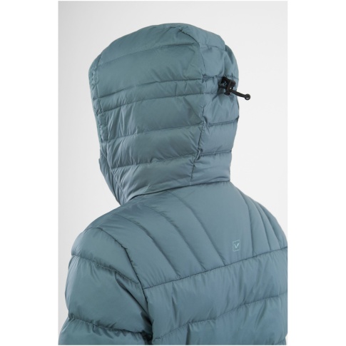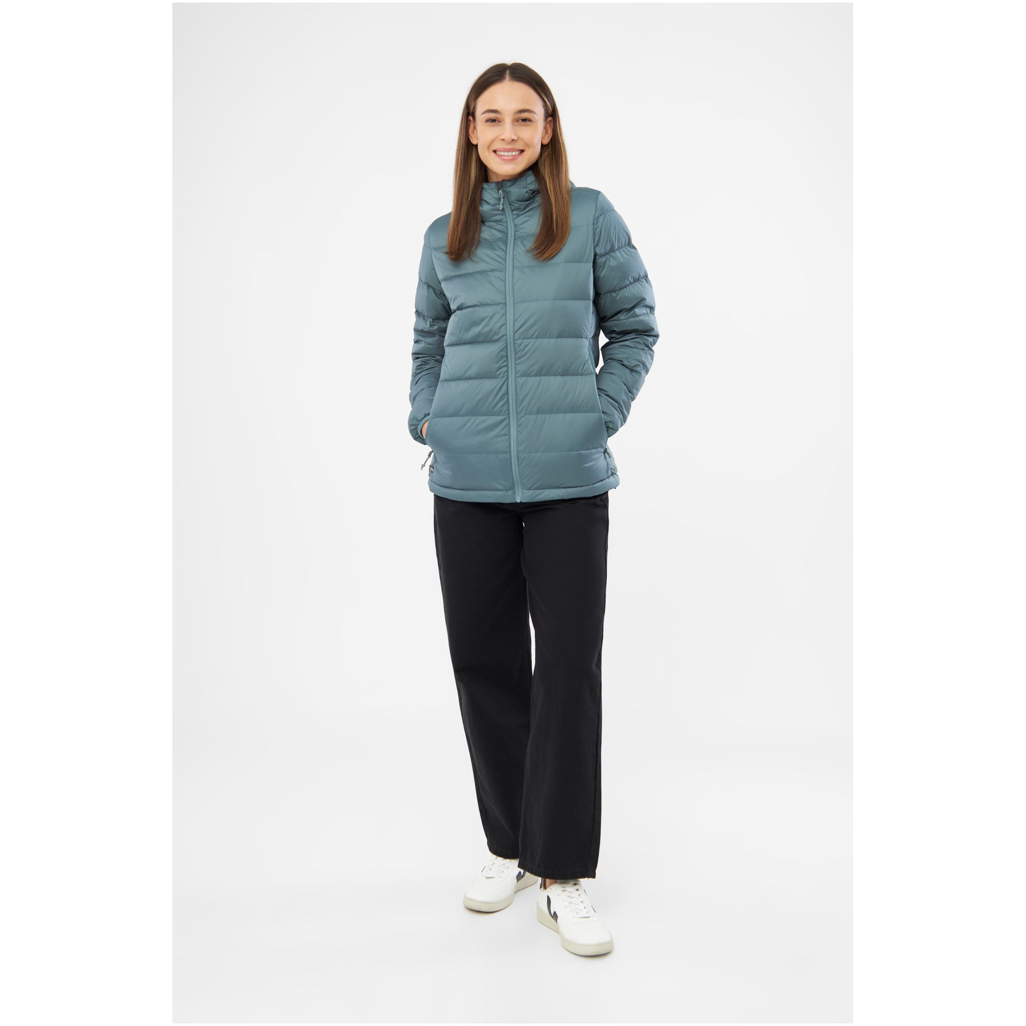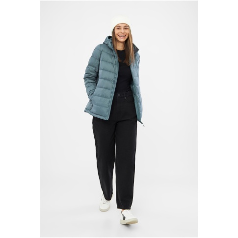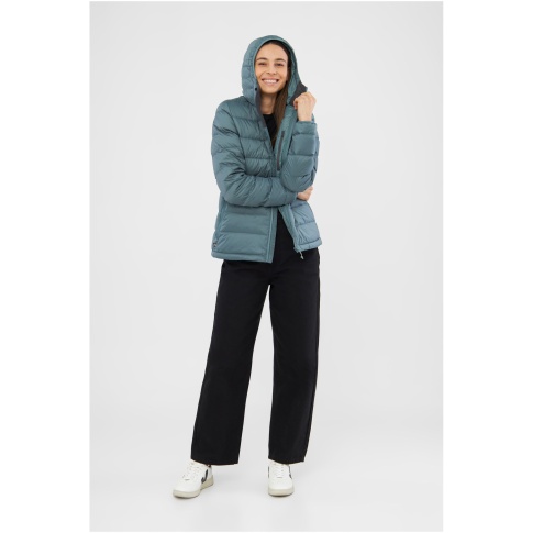 Kurtka puchowa dla kobiet Rovi to idealny towarzysz na co dzień oraz podczas zimowych aktywności w trudnych warunkach pogodowych. Trwałe materiały pochodzące z recyklingu oraz wypełnienie z naturalnego puchu zapewniają doskonałą regulację temperatury, a jednocześnie gwarantują lekkość i komfort noszenia. Puch, z którego została wykonana kurtka posiada certyfikat RDS, a więc został pozyskany z certyfikowanych gospodarstw w sposób zrównoważony. Trwałe wykończenie wodoodporne DWR C0 chroni przed wilgocią a zgrzewane pikowania minimalizują utratę ciepła. Do wykonania kurtki użyto niezawodnych i trwałych zamków YKK i SBS. Regulowany pas i kaptur sprawiają, że kurtkę można dopasować dla maksymalnej wygody, a kieszenie znajdujące się wewnątrz pomieszczą przedmioty, które chcesz mieć zawsze pod ręką. Do kurtki dołączony został pokrowiec, dzięki czemu można ją łatwo spakować i wsadzić do plecaka.