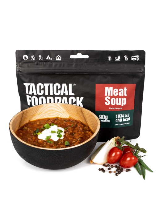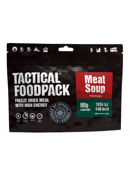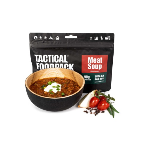 Liofilizat Tactical Foodpack Zupa mięsna 490 g to pożywne danie z wieprzowiną, ogórkiem konserwowym i przecierem pomidorowym. Tactical Foodpack Meat Soup to liofilizat odpowiedni dla osób z nietolerancją laktozy. Porcja dostarcza 440 kalorii. Poziom gęstości można regulować ilością dodanej wody. Waga netto: 90 g, waga po przygotowaniu 490 g.
