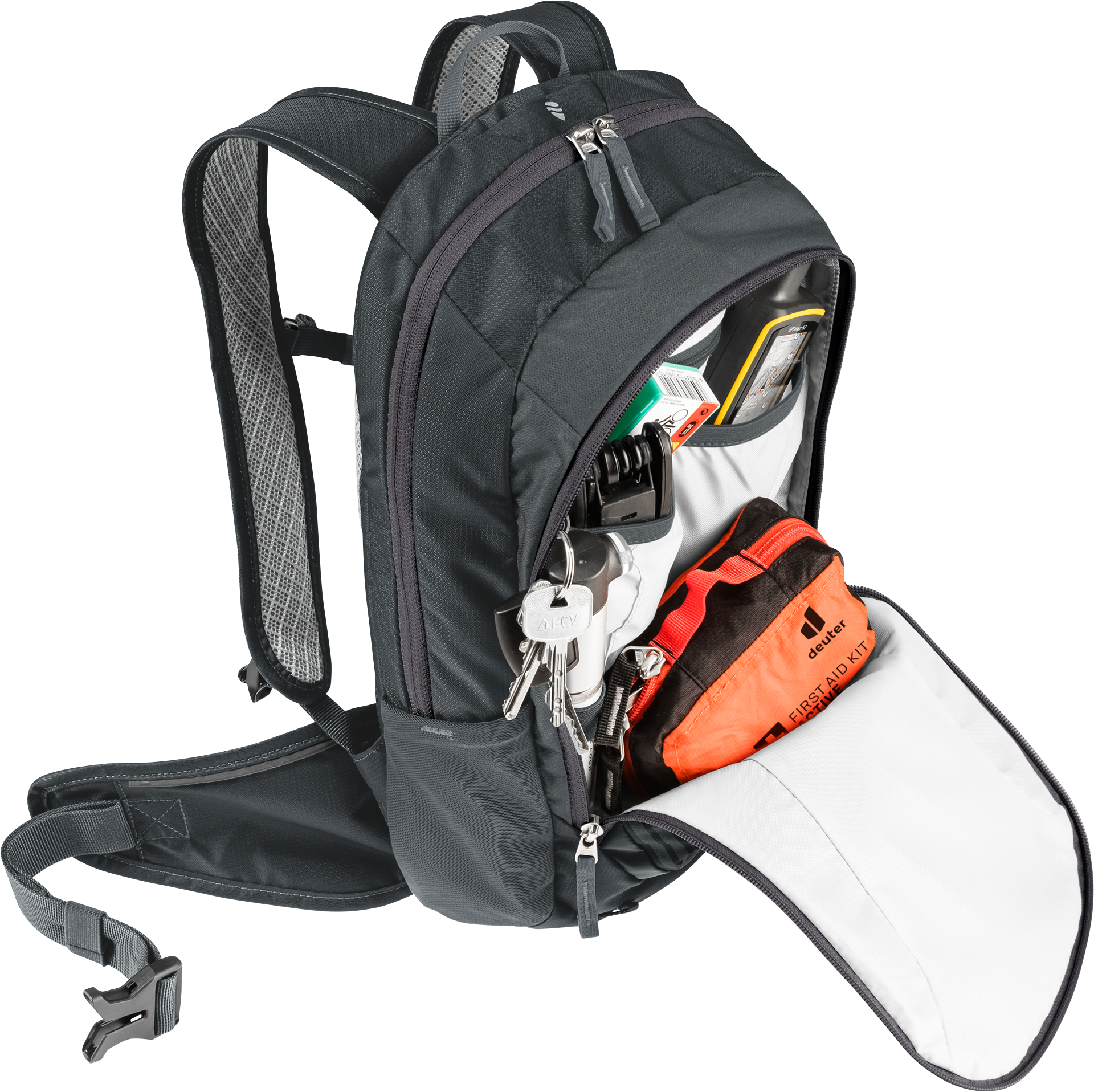 Plecak rowerowy zachwyca również przemyślanymi cechami: chowanym uchwytem na ochraniacz na dole plecaka, praktycznym uchwytem na kask z klipsami mocującymi, przestronną główną komorą na ubrania zapasowe i prowiant, szybko dostępną przegrodą na narzędzia i dwiema elastycznymi kieszeniami bocznymi.