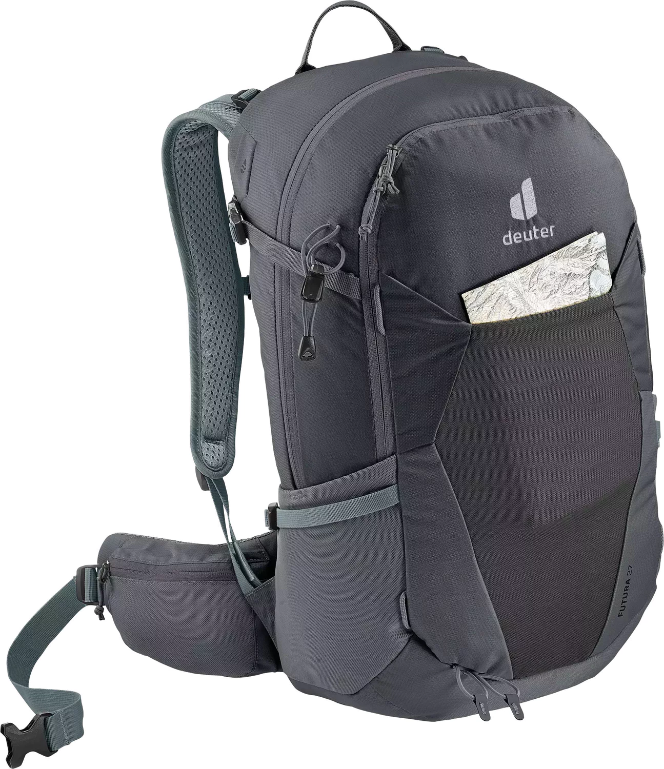 Plecak turystyczny Deuter Futura 23 w kolorze graphite/shale to bardzo dobry wybór na górskie wycieczki w cieplejszej części roku. Zastosowany system nośny Deuter Aircomfort zapewnia lepszą cyrkulację powietrza między plecakiem a plecami, co podnosi komfort podczas długiego marszu i pomaga ograniczyć nadmierne pocenie.