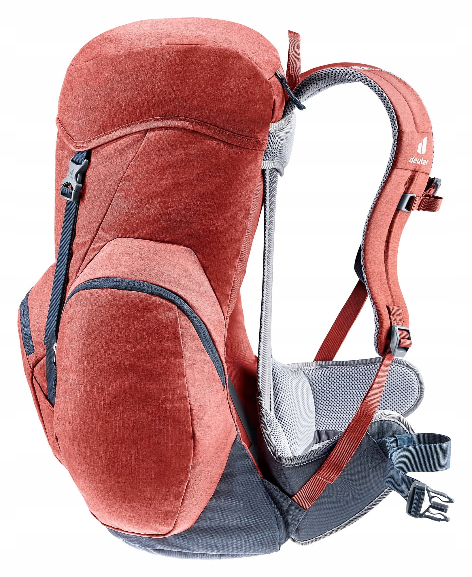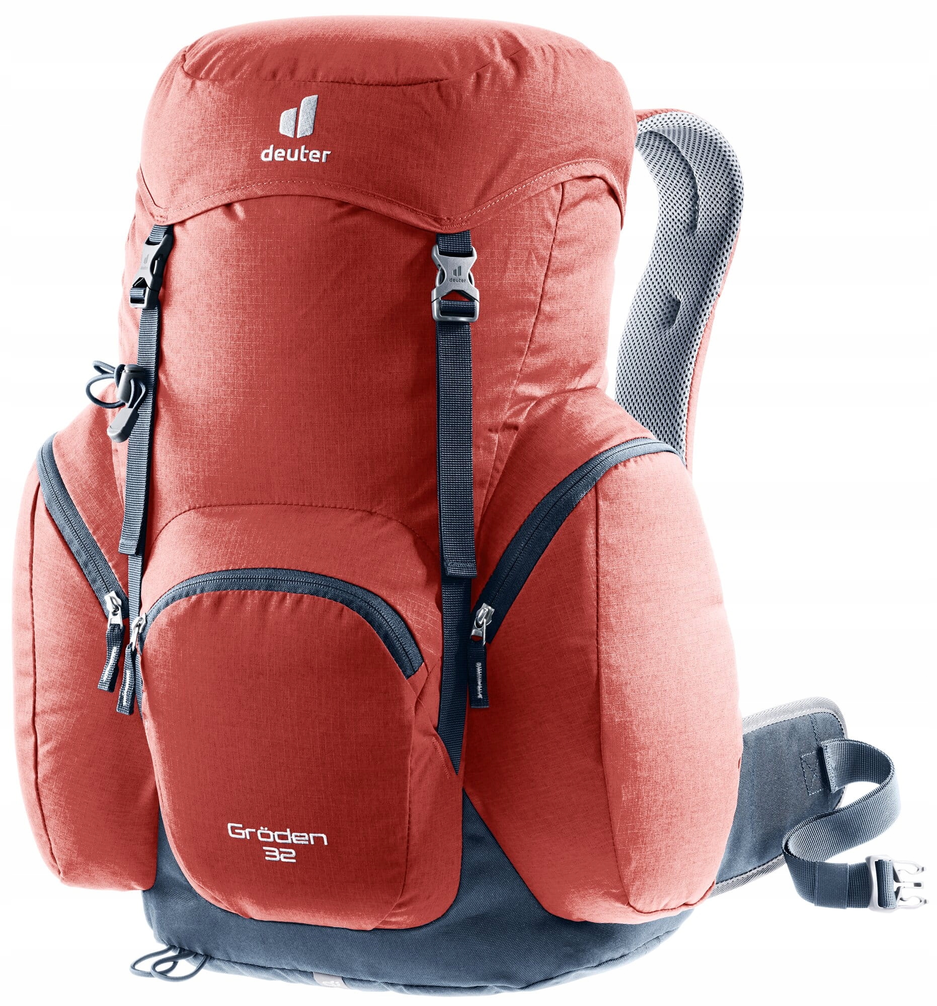 Plecak turystyczny Deuter Groden 32 (lava/ink) wyposażony jest w jedną, pojemną komorę główną z dostępem od góry. Wejście do niej zabezpiecza klapa zamykana na dwie klamry, a na jej zewnętrznej części umieszczono dodatkową kieszeń zapinaną na zamek. Z przodu znajduje się kolejna kieszeń na drobiazgi, do których chcesz mieć szybki dostęp podczas marszu. Po bokach umieszczono dwie zamykane kieszenie, które zwiększają możliwości organizacji ekwipunku. W zestawie znajduje się również zintegrowany pokrowiec przeciwdeszczowy chroniący zawartość plecaka przed opadami.