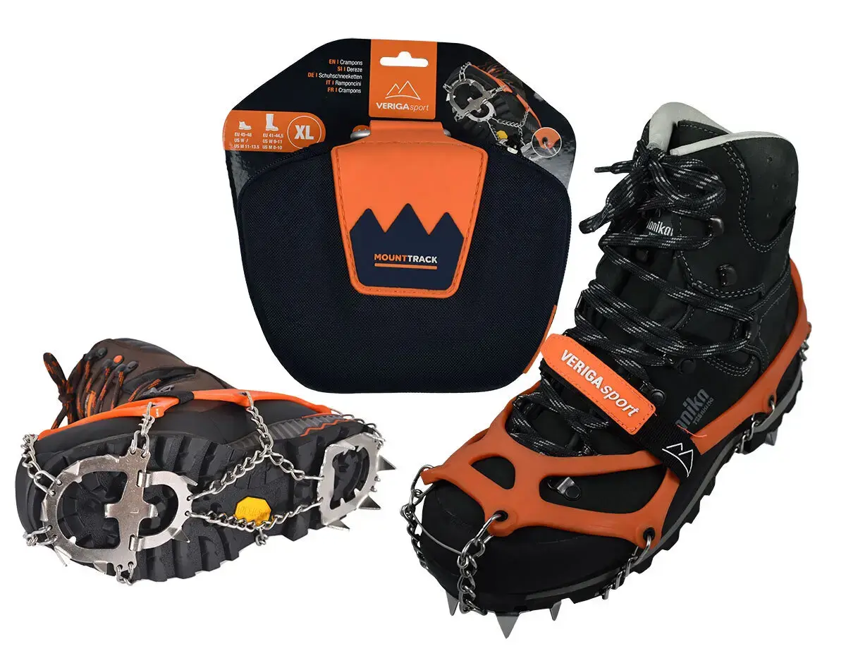 Elastyczne raczki na buty. 14 zębów z hartowanej stali oraz łańcuch ze stali nierdzewnej zapewniają bardzo dobrą przyczepność do podłoża. Wystarczy założyć je na podeszwę i zaciągnąć taśmę. Raczki są dyskretne i wygodne. Raczki są dostarczane z pojemnikiem, który ma szlufki na pasek oraz karabinek. Raczki Veriga Mount Track są przeznaczone do poruszania się w górskim terenie zaśnieżonym lub zalodzonym. Rozmiary: S (33–36), M (36–41), L (41–44,5), XL (45–48), XXL (48–50) Ciężar: S - 550 g, M - 557 g, L - 568 g, XL- 581 g, XXL - 595 g Nie nadają się do alpinizmu wyczynowego.