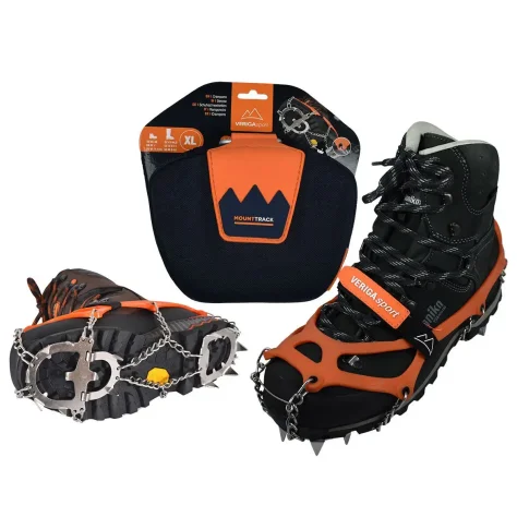 Elastyczne raczki na buty. 14 zębów z hartowanej stali oraz łańcuch ze stali nierdzewnej zapewniają bardzo dobrą przyczepność do podłoża. Wystarczy założyć je na podeszwę i zaciągnąć taśmę. Raczki są dyskretne i wygodne. Raczki są dostarczane z pojemnikiem, który ma szlufki na pasek oraz karabinek. Raczki Veriga Mount Track są przeznaczone do poruszania się w górskim terenie zaśnieżonym lub zalodzonym. Rozmiary: S (33–36), M (36–41), L (41–44,5), XL (45–48), XXL (48–50) Ciężar: S - 550 g, M - 557 g, L - 568 g, XL- 581 g, XXL - 595 g Nie nadają się do alpinizmu wyczynowego.