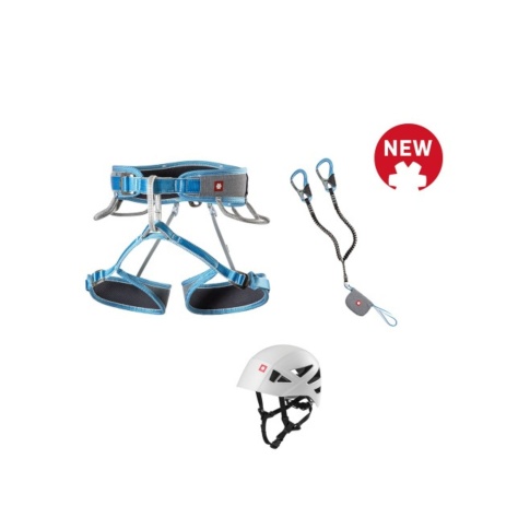 Zestaw zawiera: Uprząż Ocun Twist Tech Eco, lonżę Ocun Cpatur Lite Swivel oraz kask Ocun Shard;