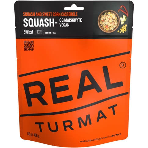 REAL Turmat Squash and Sweet Corn Casserole to liofilizowany, w pełni roślinny posiłek inspirowany klasyczną amerykańską zapiekanką. Łączy delikatną dynię i słodką kukurydzę w łagodnej, kremowej kompozycji smaków, która sprawdzi się u każdego – także u osób preferujących mniej pikantne dania outdoorowe.